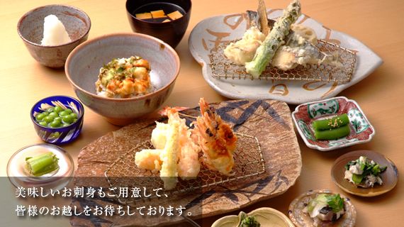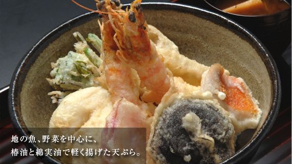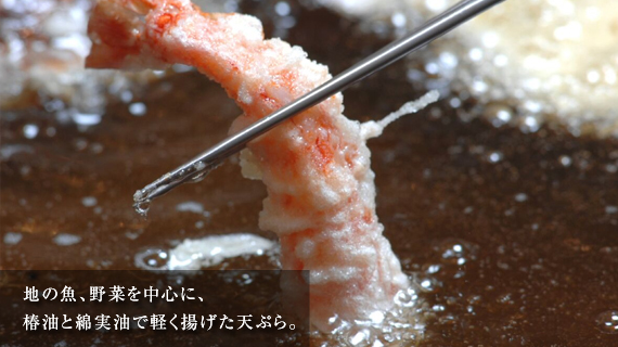 カウンター越しに目の前で揚げる専門店とてしては熱海唯一。地元の鮮魚をふんだんに使い、野菜は地元函南や韮山野菜を調理長自ら仕入れており、揚げ油には、伊豆七島椿油と綿実油のブレンドでカラッと白く軽く揚げます。
